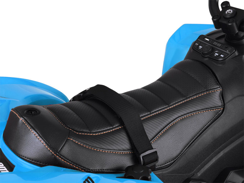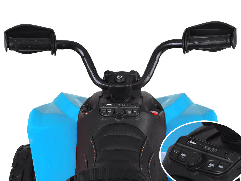 Vozidlo bylo bohatě vybaveno. Má min. hudební panel, osvětlení vpředu/vzadu, měkké křeslo potažené ekokůží s bezpečnostními pásy a pohodlný volant s kryty.Komfortní čtyřkolka splní požadavky každého řidiče.Čtyřkolka má: 2 silné motory 24V 200W + 1 x gelový akumulátor 24V 5Ah.