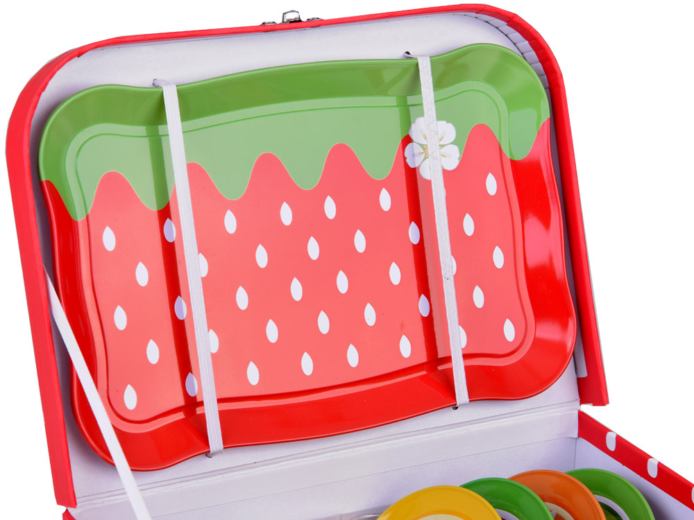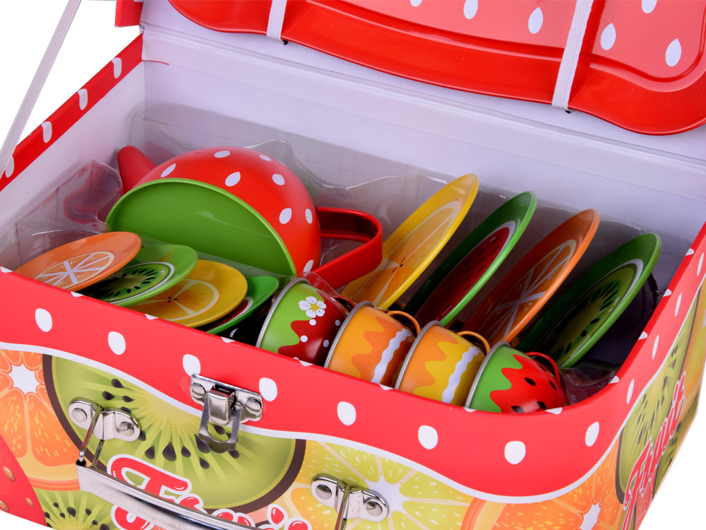 Pudełko je vyrobeno z odolné lepenky a má atraktivní grafiku s ovocem a dalšími kovovými prvky. Skvěle se hodí také na piknik, hřiště, do parku. Krásná sada, zabalená v barevném a atraktivním balení ve tvaru kufříku, ideální jako dárek. Zveme vás do obchodu Jokomisiada pro více barevných čajových sad a mnoho dalších kuchyňských doplňků.